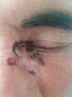 Squamous cell carcinoma is not as common, and appears red and scaly with an ulcer in the center. It is prone to distant spread so must be excised as soon as possible.
